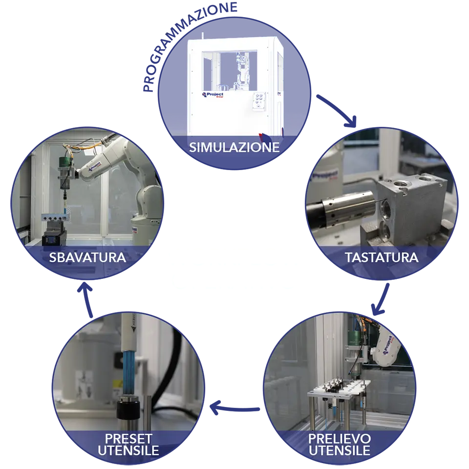 MillingCab si presenta come macchina sbavatrice di precisione che sfrutta la tecnologia robotica avanzata per una rimozione delle bave impeccabile. L’isola robotizzata è basata sul sistema di programmazione grafica CAD-CAM, dedicata all’applicazione di sbavatura di distributori oleodinamici.